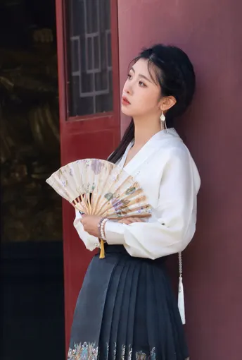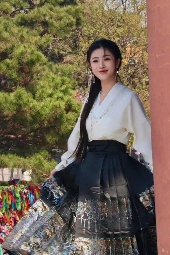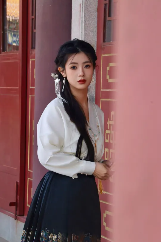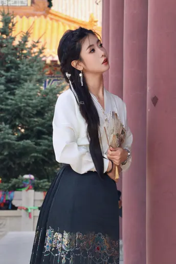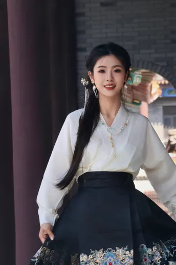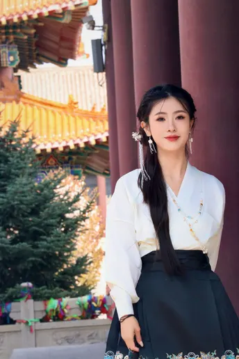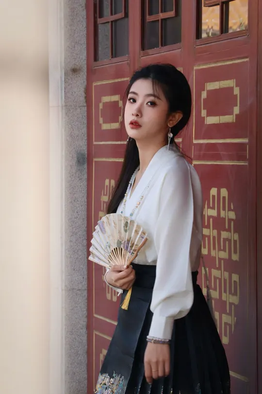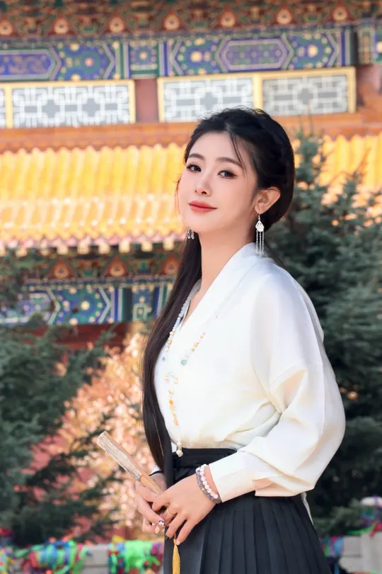八幅画面凝练东方美学的精髓,朱红门廊、鎏金纹样与素雅汉服共谱古典乐章。女子一袭白衣黑裙,珍珠流苏摇曳生姿,折扇轻执间尽显温婉;马面裙上繁复刺绣与建筑彩绘遥相呼应,红墙黛影、苍松经幡为幕,光影斑驳中勾勒出跨越千年的风雅。传统纹样与现代审美碰撞,既有宫廷的华贵气韵,又含自然的诗意灵动,将含蓄典雅的东方美学演绎为永恒的新风尚。