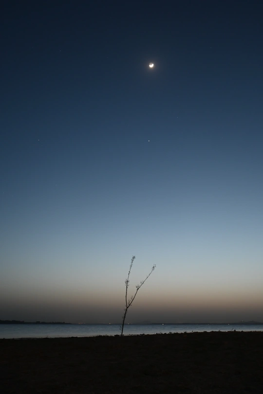 我在蓝调时刻发现了这棵小树,我按下快门,定格它与星月的合照