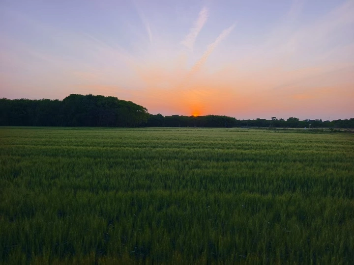 在这幅画面里,一片广袤无垠的麦田如绿色的海洋,麦浪轻轻起伏,似在低声诉说着田园的故事。夕阳缓缓西沉,将天空染成了迷人的橙红色,与下方的绿色麦田相互映衬,构成了一幅绝美的自然画卷。 远处的树林,像是大自然勾勒的墨绿轮廓,静静地守护着这片麦田。天空中,几缕轻薄的云彩被夕阳镶上了金边,如梦幻的丝带在天际飘荡。 这一刻,置身于这片田园之中,能感受到微风的轻抚,能听见麦穗的细语,更能体会到大自然的宁静与美好。夕阳的光辉,不仅照亮了这片土地,也温暖了每一个向往自然的心灵。