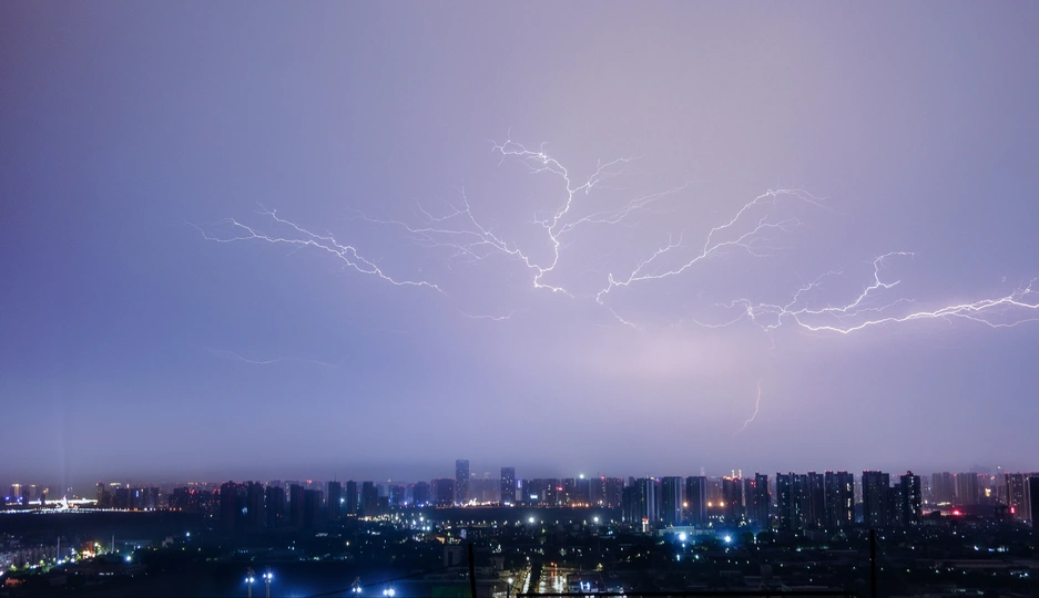 夜空中闪电划破,与城市灯火交织, 奏响震撼自然与都市的乐章