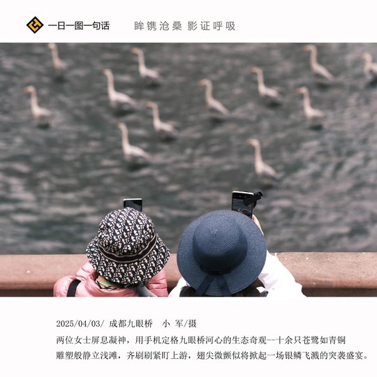 九眼桥秋河如镜,两位女士举机定格十余苍鹭凝神如塑——水墨画中的铁钩兀立河心,同向锁波伺猎,恰似天地为倏然掠影写下的伏笔。
