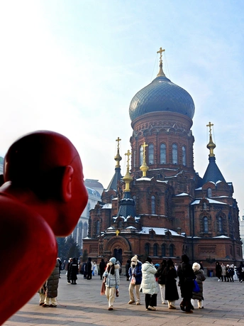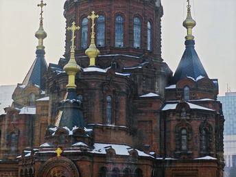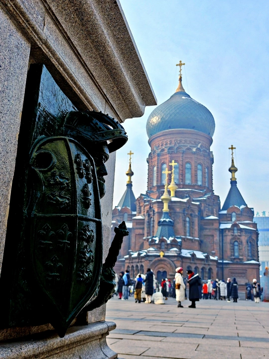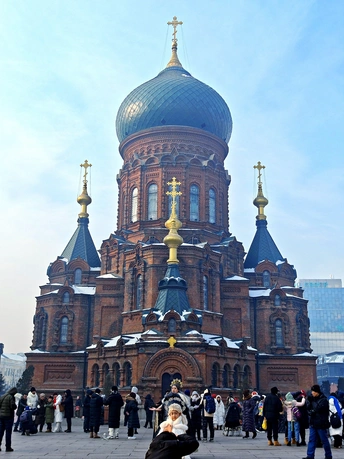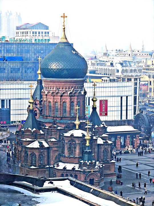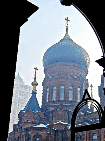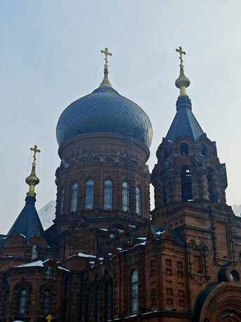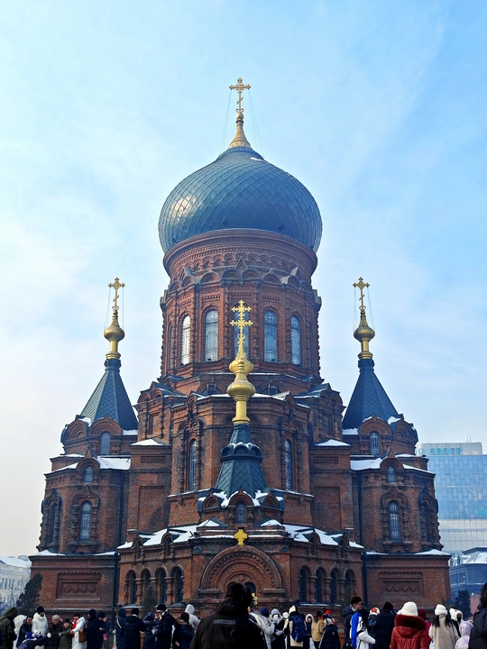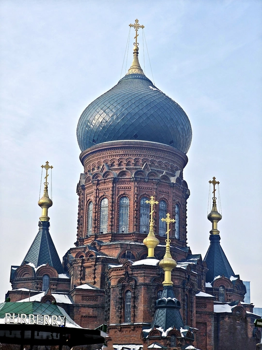 哈尔滨圣·索菲亚教堂在建筑风格上以拜占庭式为主,同时融合了俄罗斯传统建筑元素,如洋葱头穹顶、帐篷顶等,是拜占庭艺术与俄罗斯建筑风格结合的典范,展现出独特的艺术魅力。
