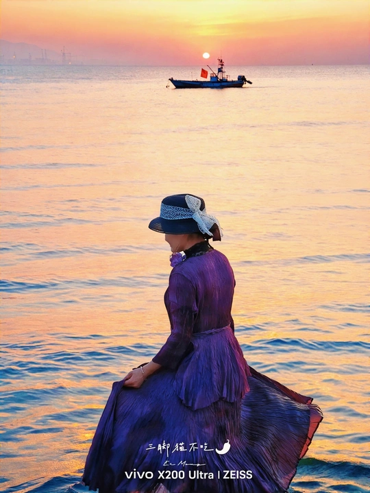 海浪在脚边碎成星星,鎏金暮色浸透雪纺裙摆。渔船的剪影在橘色潮汐中晃成逗号,快门按下时,落日正沿着蕾丝滚边滚入深海。 风把发丝和浪花吹成同一种弧度,远处归航的汽笛惊起鸥鸟掠过镜头。潮水漫过脚踝的刹那,波光在裙褶里织就银河,此刻连晚霞都在配合裙角飞扬的轨迹——时光被海风吹散成盐粒,而我想把这一刻的温柔藏进绸缎褶皱,等暮色漫过桅杆时,再轻轻抖落成发光的诗行。