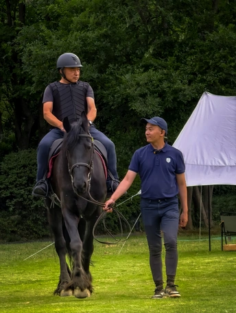 绿色的草地和背景的树木带来自然、清新的感觉,让人仿佛置身于宁静的户外环境之中。骑马者与引导者的互动,传递出一种默契与信任,增添了画面的温馨感。整体氛围轻松惬意,给人一种亲近自然、享受户外活动的美好感受。