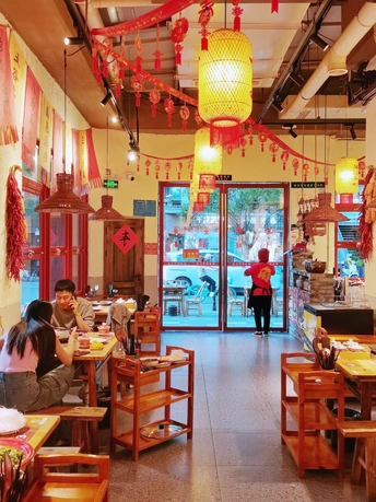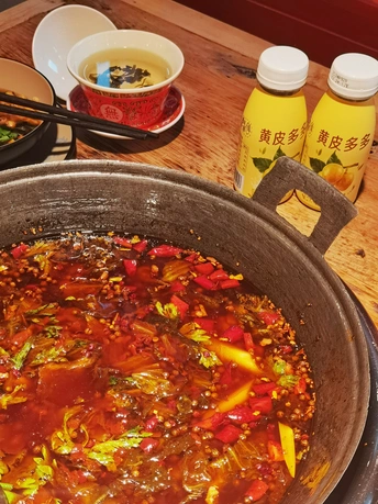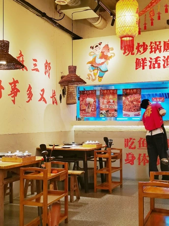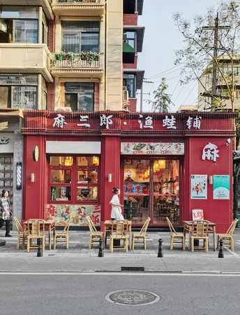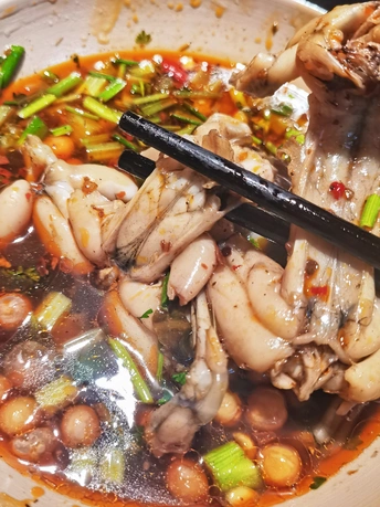 这家渔蛙铺把市井烟火气吃进肚里~ 在老槐树影斑驳的青石板路上晃荡时,被街角飘来的酸菜香勾住了脚——「麻三郎渔蛙铺」的明档操作间里,小哥正快手处理活蹦乱跳的美蛙,剪刀起落间,新鲜劲儿隔着玻璃都能感受到。 🔹【铁锅现炒的鲜活感,藏在烟火气里】 水池里的美蛙还在扑腾,就被捞进陶瓷盆收拾得干净利落。「现杀的才够嫩!」大姐往热铁锅里撒佐料的动作行云流水,清油滋啦爆开的瞬间,酸菜和小米辣的香气直接窜进鼻腔。灶台上十几种香料罐错落码着,最显眼的老坛酸菜陶瓮里,酸香浓郁的酸菜丝堆得冒尖,光看就知道这锅汤底差不了。 坐在靠窗的木桌旁,竹编吊灯投下暖黄的光,听着后厨铁锅铲碰撞的声响,突然就懂了老成都的市井温柔。 🔹【铁锅沸腾时,才是惊喜的开始】 端上桌的铁锅咕嘟咕嘟冒着泡,红亮的汤底酸得鲜爽,细品还有泡椒的微辣在舌尖打卷。夹起一只美蛙,小腿肉轻轻一抿就脱骨,肌理分明的白嫩肉质裹着油碟,小米辣的辛香和香油的醇厚层层叠叠,紧实的蛙腿肉在齿间弹开,辣意从舌尖漫到喉头,却让人停不下筷子。 配菜里最难忘的是酸菜粉丝——吸饱汤汁的粉丝裹着金黄的酸菜丝,红亮油花挂在筷尖,酸辣交织的滋味直抵胃底。土豆煮