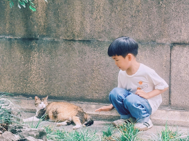 宁静的清晨,小男孩轻轻蹲下,伸出手,试图与慵懒卧着的猫咪交朋友。阳光洒落,这一刻,童真与萌趣交织,时光都变得柔软又惬意。