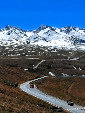 在伊犁的空中草原,拍摄了远处的雪山以及山下的公路,表现一种诗意和远方。