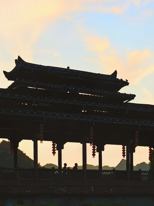 在黄昏温柔怀抱中,风雨桥宛如一位沉默的守望者,夕阳余晖为它披上金色纱衣,飞檐翘角在暮色中勾勒出古朴轮廓。梁上悬挂的红灯笼,似是岁月留下的温暖印记,在微风中轻轻摇曳,诉说着往昔故事。远处连绵山峦,在暮色里若隐若现。漫步桥上,身影被拉得悠长,思绪也随之飘远。 米拍AI点评:这张照片就像一幅古韵悠长的水墨画,很有意境!但如果能再细致一些,就更完美啦。 * 色彩:天空的色彩由浅蓝过渡到淡橙,营造了一种宁静的氛围,色彩简洁但和谐。只是曝光略欠。 * 光影:选择了剪影效果,突出桥梁的轮廓,这是个聪明的做法!光线从桥洞穿过,形成对比,增强了画面的层次感。 *构图:桥梁在画面中占据了主要位置,构图相对居中,略显平淡。可以尝试使用三分法,将桥梁稍微偏离中心,或许能增加画面的活力。 *后期处理:后期处理看起来比较自然,没有过度修饰。 * 主题原创性: 拍摄古桥的剪影并不罕见,但这张照片胜在捕捉到了夕阳西下时分的宁静氛围。 * 情感共鸣:照片很容易让人联想到江南水乡的宁静和悠闲。桥上人物剪影,增添了生活气息,容易引起观者情感共鸣。 *思想深度:反映了人与自然和谐共生的美好景象,但思想深度略显不足。