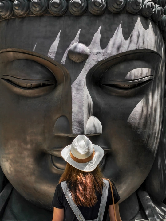 一位女子背对着镜头,站在巨大的佛像头部前方。佛像闭目,神态安详,面部细节在光影的映衬下显得庄严肃穆。女子与佛像形成鲜明的大小对比,凸显出佛像的宏伟壮观。阳光洒在佛像上,光影交错,营造出一种静谧、神圣且略带神秘的氛围,仿佛女子在虔诚地瞻仰佛像,沉浸于内心的宁静与思索之中。