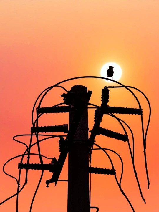 余晖似火,泼洒在天际,将世界晕染成一片绚烂的橙红。一只孤鸟,悄然栖于纵横交错的电杆之上。此刻,它是这天地间的主角。 电杆线条硬朗,与柔美的夕阳形成鲜明对比,孤鸟的剪影恰似点睛之笔。那鸟于高枝之上,身姿挺拔,似在凝望远方,又似在思索。暮烟袅袅,为画面蒙上一层薄纱,增添了几分缥缈与神秘。 它虽孤独,却未显怯懦。在这黄昏时分,于高处迎接落日的洗礼,独自品味时光的静美。这画面,是自然的诗意馈赠,也让我们看到生命在孤独中的坚守与力量。