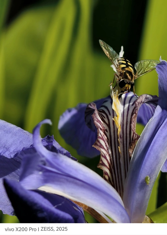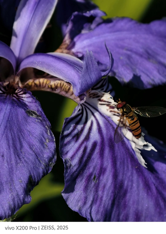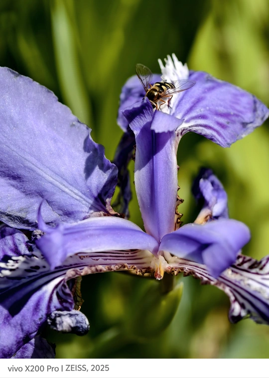 在绿意簇拥间,紫色鸢尾肆意绽放。那如蝶翼般的花瓣,轻盈舒展,每一道纹理都藏着自然的诗意。阳光倾洒,为它披上一层金缕,引得蜜蜂也来奔赴这场绚烂花事。它静静伫立,似在诉说着时光里的温柔与浪漫。