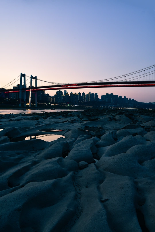 这张照片记录了傍晚时分长江边的壮丽景色。天空由浅蓝渐变为深蓝,预示着夜幕的降临。远处的城市天际线在暮色中显得宁静而遥远,高楼大厦的轮廓在柔和的光线中若隐若现,仿佛一幅剪影画。鹅公岩长江大桥横跨江面,桥上的灯光已经亮起,红色的灯光在桥面上划出一道道流动的光带,为这座桥梁增添了一抹温暖的色彩。桥下的江水平静,反射着天空和桥梁的光影,显得格外宁静。前景中的礁石形态各异,它们在江水的冲刷下形成了波浪般的纹理,仿佛是大自然的雕塑作品。这些礁石在夕阳的余晖中呈现出深浅不一的灰色调,与远处的城市和桥梁形成了鲜明的对比。整个画面充满了宁静与和谐,展现了自然与人造景观的完美融合。