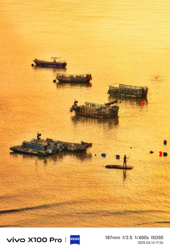 夕阳西下,金色光辉铺满海面,几艘渔船静浮其上,一位渔人立于板上,天地间尽是岁月的安然与生活的诗意。