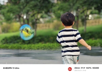 下午阳光和煦,妈妈拍出泡泡,孩子兴趣地追着泡泡跑,泡泡里映照着绿植,梦幻。