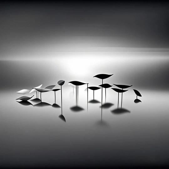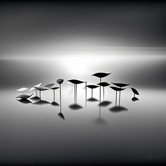 这张黑白摄影作品,简洁而富有禅意,仿佛置身于一个平静而超现实的世界,让人感受到一种独特的宁静与沉思。 * **色彩:** 画面采用黑白单色,利用灰阶的微妙变化,营造出一种极简主义的视觉效果。不同层次的灰色过渡自然,增强了画面的空间感和层次感。 * **光影:** 光线柔和而均匀,主体轮廓清晰,倒影加强了画面的纵深感和对称性。高光部分避免了过度曝光,保留了细节,阴影部分处理得当,没有出现死黑。 * **构图:** 构图简洁,主体位于画面中心偏下,符合视觉习惯。水面倒影增强了画面的对称性,营造出一种平衡的美感。主体的大小和间距排列有序,增加了画面的节奏感。 * **后期处理:** 后期处理精细,黑白影调过渡自然,噪点控制良好,增强了画面的质感。但可以尝试稍微增加对比度,使主体更加突出。 * **主题原创性:** 主题表达简洁而富有诗意,通过对植物形态的抽象表达,传达了一种宁静、和谐、超脱的情感。具有一定的原创性,能够引发观者的思考。 * **情感共鸣:** 画面宁静、平和,能够引起观者的共鸣。简单的元素组合,传递出一种深邃的意境。