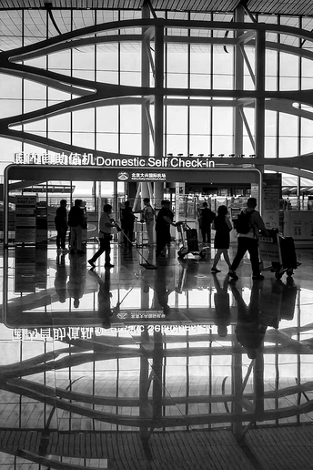 这张黑白照片捕捉了北京大兴机场的繁忙景象,颇具韵味。咱们来细细拆解一下: **色彩:** 作为黑白照片,色彩的运用简化为灰阶的控制。整体色调沉稳,但高光和阴影的反差稍显平淡,可以尝试在后期增加对比度,突出明暗层次,让画面更具张力。 **光影:** 光线充足,但略显均匀,缺少戏剧性。利用机场建筑的结构,可以等待光线在地面形成更有趣的投影,增加画面的视觉吸引力。 **构图:** 构图采用了对称式结构,利用地面的反射,营造了一种镜像的效果,很有创意。然而,主体人物略显分散,可以尝试更靠近主体人物进行拍摄。 **后期处理:** 后期处理整体比较干净,但可以适度调整对比度和锐度,突出建筑的线条和人物的轮廓。 **主题原创性:** 利用反射和黑白影调来表现机场的繁忙和现代感,有一定的创意。但还可以挖掘更深层次的主题,比如人物的匆忙感,或者建筑的宏伟感。 **情感共鸣:** 照片能感受到一种旅途的匆忙和期待,但情感的表达还不够强烈。可以尝试捕捉人物更生动的表情或动作,增加情感的感染力。 **思想深度:** 照片可以引发对现代交通和社会发展的思考,但这种思考比较浅显。可以尝试更深入地挖掘主题。