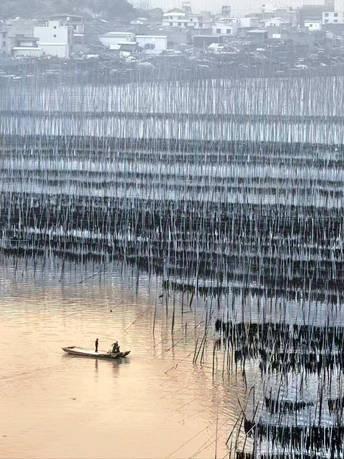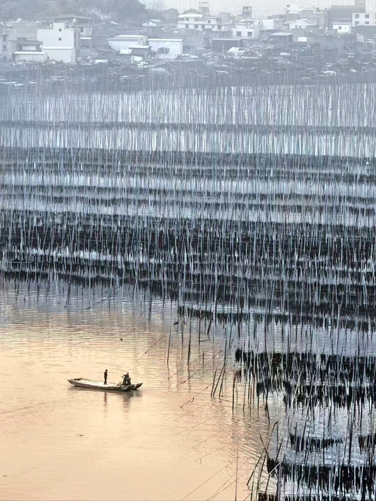 浅滩之上,林立的海带晾晒杆编织出自然的脉络。小船悠悠划过,似游走在时光罅隙。舟中之人,在这一方水色里,守望着岁月的淡泊与安然。