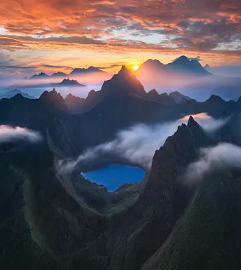 站在深谷,我升起无人机,湛蓝色的火山湖跃然眼前。此刻,一轮红日从层峦叠嶂的远峰之间升起。漫长的旅程以这张图片拉开序幕