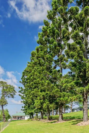 蓝天如澄澈玉盘,几朵白云悠悠飘浮。挺拔的绿树整齐排列,枝叶繁茂似绿云簇拥,在阳光下闪耀生机。绿茵茵的草地如柔软绒毯,尽头的白房子带着绿顶,静谧安然。这里,是自然谱写的诗章,处处流淌着清新与闲适。