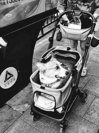 色彩:黑白照片嘛,色彩就直接忽略了。不过转黑白的处理还算干净利落,没有出现大面积的死黑或者死白,细节保留得还行。 光影:光线比较平均,缺乏戏剧性。如果能抓到更有趣的光影,比如侧逆光,能让柯基更有立体感和故事性。现在略显平淡。 构图:有点平铺直叙。主体(柯基)虽然在画面中,但周围环境的干扰有点多。可以尝试更近的距离,或者变换角度,让柯基成为绝对的焦点。另外,左侧的黑色物体有点抢戏,可以考虑避开,或者利用前景虚化来弱化它。 后期处理:黑白转换的整体效果不错,但可以适当增加对比度,让画面更具冲击力。同时,可以稍微锐化一下,让柯基的毛发细节更清晰。 主题原创性:主题很日常,也很有趣,宠物和婴儿车的结合挺有意思。但是,还可以挖掘更深层次的主题,比如宠物和主人的关系,或者城市生活中的宠物文化等等。 情感共鸣:柯基的表情很有戏,歪着头,眼神里充满了好奇。这个表情很容易引起爱狗人士的共鸣。如果能捕捉到更多细节,比如柯基和主人的互动,情感的传递会更强烈。 思想深度:照片反映了现代都市生活中宠物地位的提升,可以引发人们对人与动物关系的思考。但目前深度稍显不足,可以从更宏观的角度去挖掘。