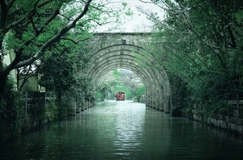 春日里小船穿行于桥洞间,绿意盎然,奏响一曲悠然的春之乐章。