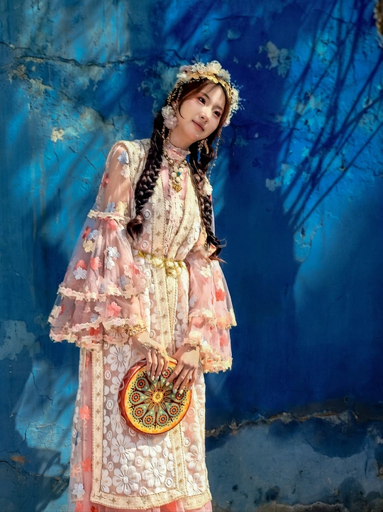 在新疆卡赞其老城区,以蓝色的墙为背景,拍摄了身穿民族服饰的美女,表现冷暖色对比、光影、民族服饰及美女的神态表情。