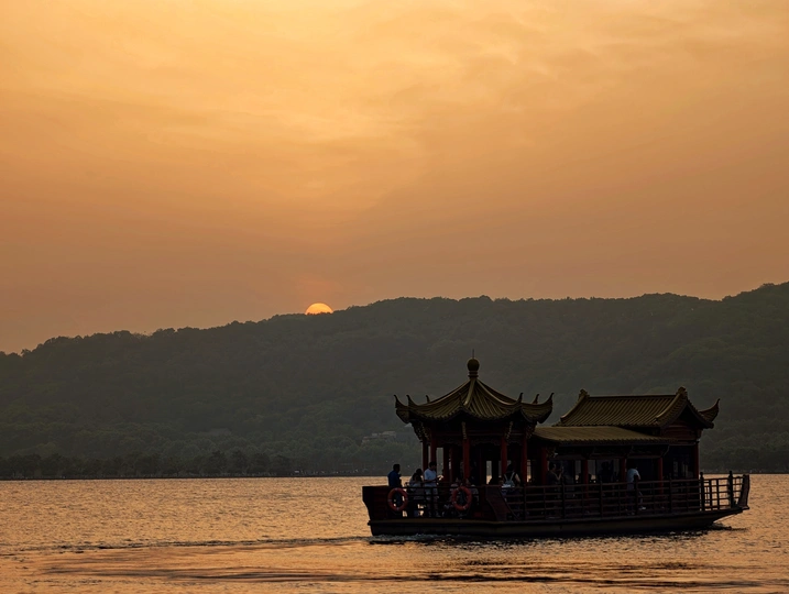 夕阳沉落于山峦之际,将天空染成金黄。湖中的古式画舫,载着旅人,也载着这一湖的诗意与温柔,在晚风中驶向暮色深处