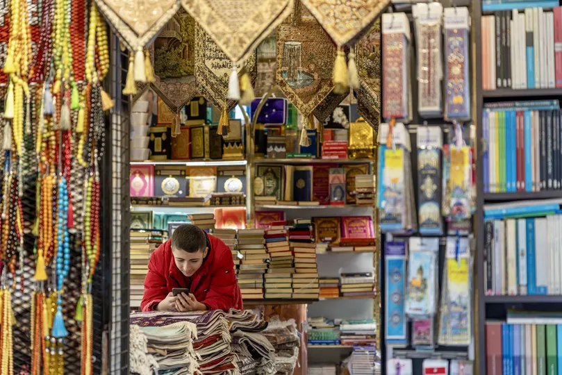 满目的彩珠、精致的挂饰,还有堆成小山的书籍,店铺内的红衣少年,沉浸在自己的一方小天地里。热闹集市中的这份自在,是生活独有的松弛感~