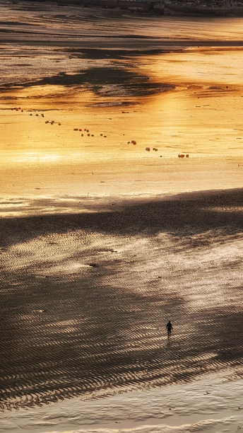 夕阳的余晖,如金色的纱幔,轻柔地披在这片广袤的滩涂上。潮水退去,留下一道道细腻的纹理,似岁月书写的诗篇。一个孤独的身影,在滩涂间缓缓前行,渺小却坚定。远处,那些散落的浮标,像是沉默的守望者,陪伴着独行者。这一刻,天地间仿佛只剩下他,以及脚下这片被时光镌刻的滩涂,他在这寂静的世界里,踏出属于自己的节奏,走向未知,也走向内心深处的宁静。