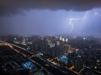 夜幕笼罩,乌云翻涌。一道闪电如银蛇般突然划破暗沉的天空,刹那间,城市被照得亮如白昼。高耸的西安电视塔在雷闪的映衬下,轮廓愈发清晰。它宛如一位坚毅的守望者,在雷电交加中岿然不动,见证着这惊心动魄的自然力量与都市夜景的奇妙融合。