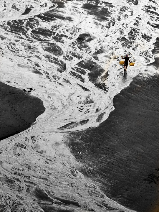 这是一幅黑白交织的画卷,潮汐在滩涂上绘就了错综复杂的纹理,宛如大地的脉络,记录着岁月的更迭与时光的流逝。一位渔家女,于这广袤滩涂之上踽踽独行。她肩负着沉甸甸的箩筐,那是生活赋予的重量,亦是希望的承载。