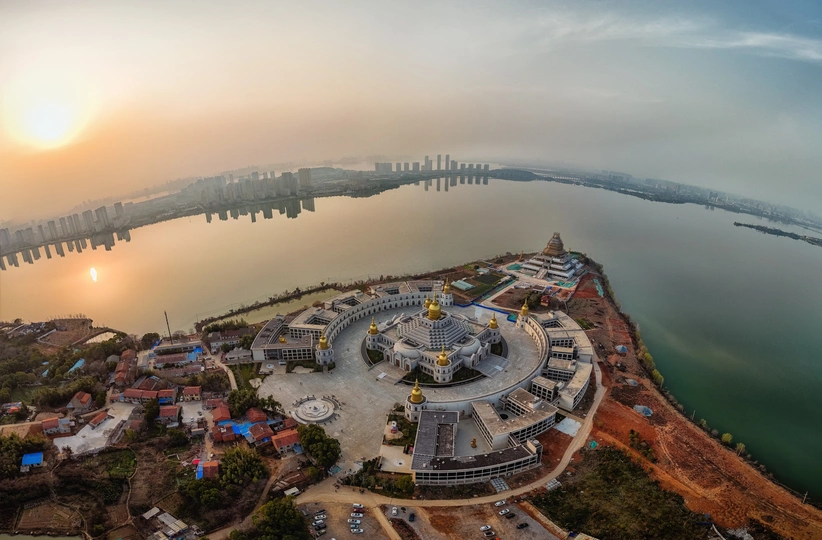 无人机掠过暮色中的莲华寺,千年古刹以环形殿宇托举起鎏金宝顶,宛如时空之眼凝视着江城变迁。
