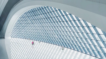 在这座建筑的光影之境中,线条交织成诗。阳光透过几何形状的窗格洒落,于地面绘就抽象的图案。两人并肩而立,似在这静谧的空间里,聆听建筑与光影的私语,时间在此刻仿佛也放慢了脚步,只留下这一方充满艺术感的天地,承载着静谧与美好。