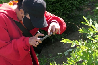 满都海公园里,身着红色衣服的一摄影师在用手机拍摄牡丹花,抓拍到了摄影师专注的神态。