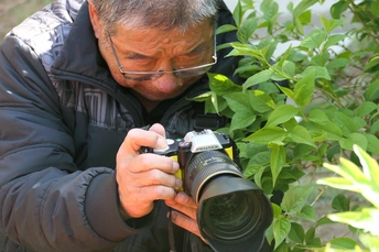 满都海公园里牡丹花开花了, 一摄影师在专注地调整相机角度,认真地拍摄牡丹花。