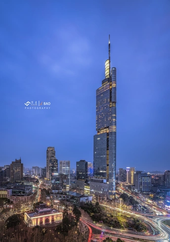 南京著名地标建筑紫峰大厦与鼓楼同框