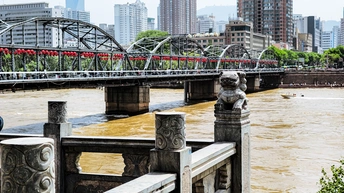 这张图片展示了兰州一座著名的横跨河流的大桥--中山桥,桥梁结构为钢架拱形设计。黄河水平静流淌,颜色呈现出浑浊的黄色调。前景中有精美的石雕栏杆装饰物,其中一个雕刻着狮子形象,威武霸气。背景可以看到现代城市的高楼大厦林立,显示出城市化的特征。整体上给人一种传统与现代交融的感觉。