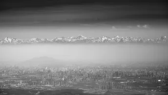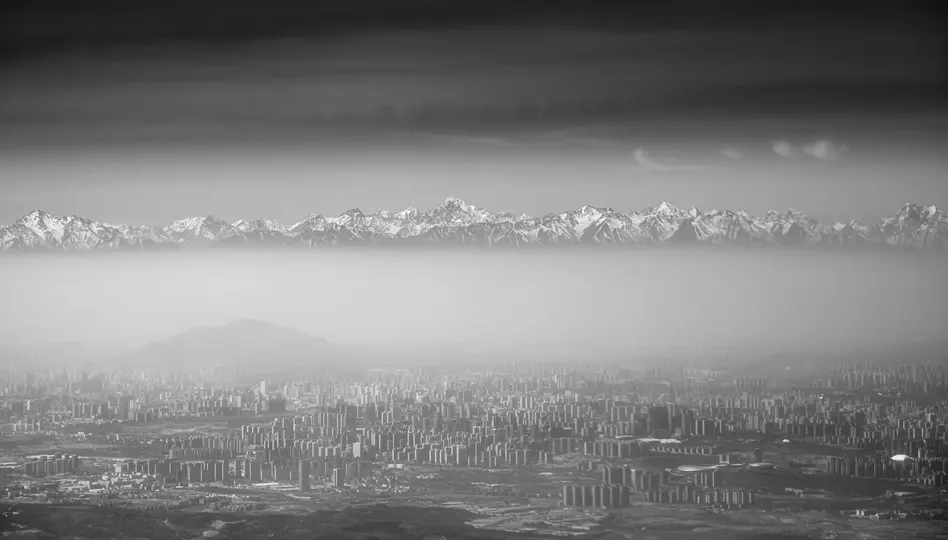 飞行员的视角,乌鲁木齐,梦境般空间交错的城市,城市上空氤氲的雾霭,将远处的雪山与城市分割,纵深感在这里仿佛消失,人眼不再有景深的感觉,雪山如海市蜃楼幻境一般悬浮在城市上空,正应其名-天山,自天上来,横亘不止千里也