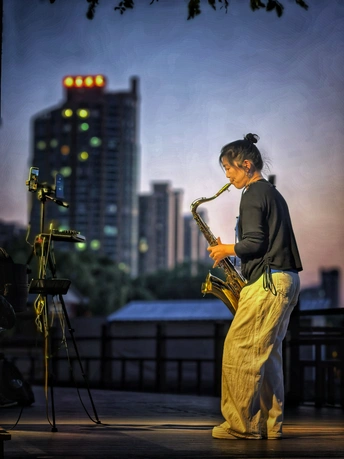 #祎璠纪实# #手机365-3113# 暮色渐浓,城市在余晖中朦胧。她立于街头,萨克斯轻抵唇边。指尖灵动,乐音倾泻而出,似在与喧嚣的都市对话。每一个音符都承载着梦想与热爱,在晚风中飘荡,编织出独属于她的音乐梦境。
