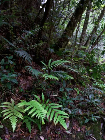 密林深处的绿之交响 踏入密林深处,仿佛跌入一片幽邃的绿色梦境。阳光被层层叠叠的树冠筛成细碎的金斑,洒落在地面,滋养着林下万千生灵。 苔藓如同柔软的绿毯,无声地蔓延在腐殖质深厚的土地、布满岁月痕迹的倒木与嶙峋怪石之上,以细腻的触感记录着森林的呼吸。蕨类植物在微光中舒展身姿,鹿角蕨形如鹿角般苍劲,鸟巢蕨则宛如天然的绿巢,层层叠叠的叶片将有限的光线化作生长的能量。耐阴的草本植物悄然生长,叶片大多宽大而薄,三脉紫菀低垂着蓝紫色的小花,与鹿蹄草的绯红铃铛相互映衬,在昏暗的林下奏出生命的韵律。 藤蔓植物是林间的舞者,它们攀附着高大树木,以螺旋状的姿态向上生长,叶片与枝干交织缠绕,织就一张立体的绿网。这些密林之下的植物,在永恒的幽暗与静谧中,用独特的生存智慧,编织出了属于自己的生态华章。