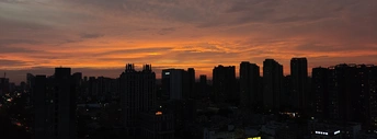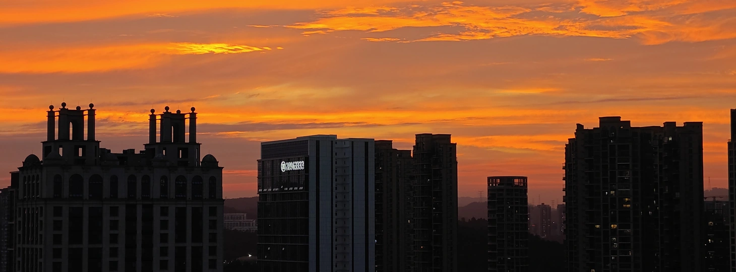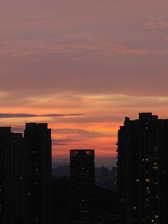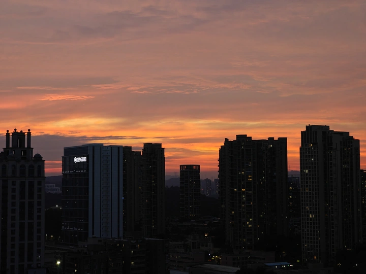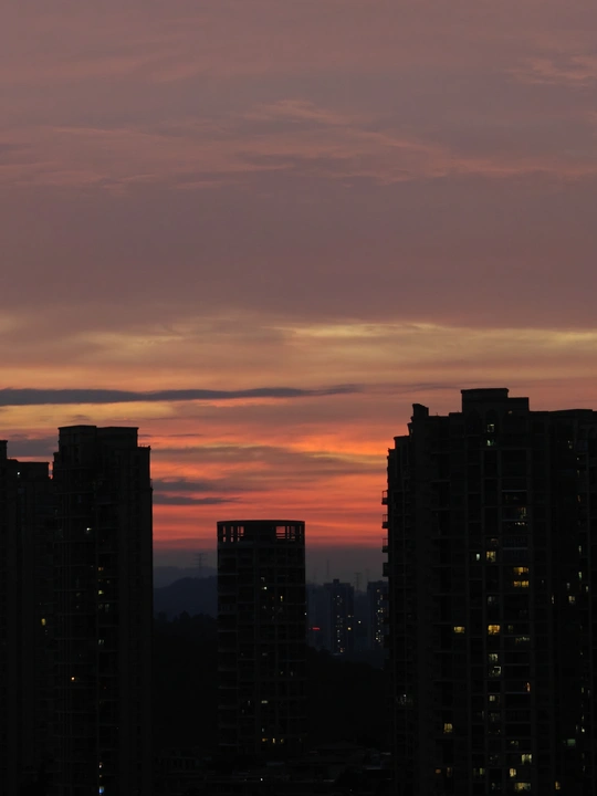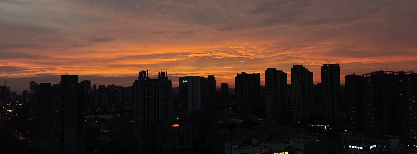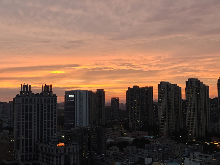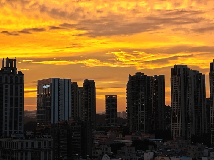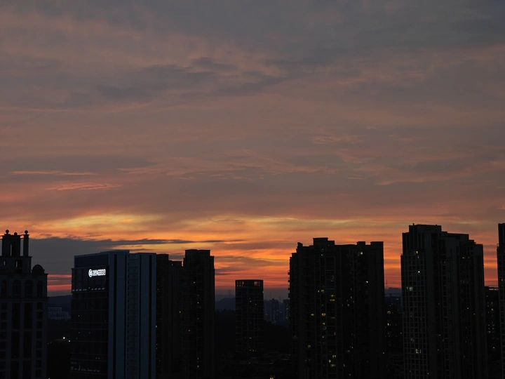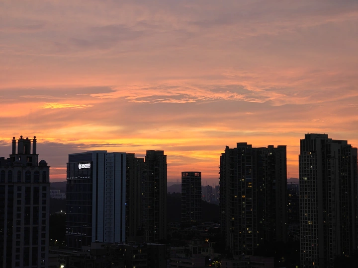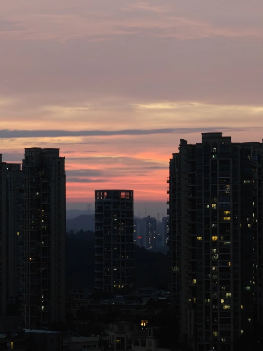 黄昏时分,天空像一幅多彩的画卷,绚丽的颜色在高楼间渐变。从金橙到深蓝,每一分每一秒都凝练着大自然的诗意。 这个时刻,总是让人觉得宁静而又充满希望。