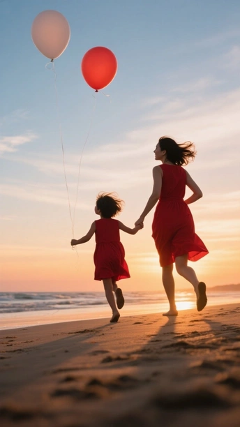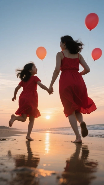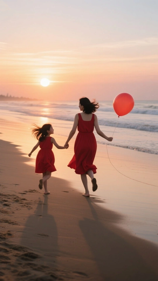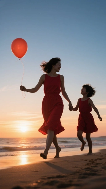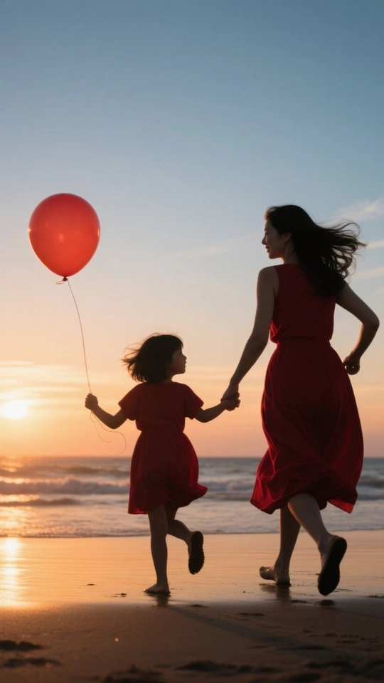 你看向我的目光 藏着星河,藏着港湾 从青丝到华发的流转 爱如藤蔓,岁岁年年蔓延 ……………………………… 这张照片充满了温馨和活力,构图和光影都把握得不错,让观众感受到母女间的亲情。 色彩:** 红色连衣裙与背景的渐变色天空形成对比,鲜明而吸睛。夕阳的暖色调与红色的热情相互呼应,营造出温馨的氛围。 光影:** 夕阳的柔和光线勾勒出人物轮廓,营造出剪影效果,强化了视觉冲击力。地面的反光增加了画面的层次感。构图:** 构图简洁明了,人物主体位于画面中央偏左,符合视觉习惯。留白适当,给观者想象空间。母女奔跑的动态感很强。 后期处理:** 后期处理整体自然,色彩和对比度调整适中,没有过度修饰的痕迹。建议在后期可以适当调整曲线,提亮暗部细节,让画面更通透。 主题原创性:** 母女在海边奔跑,气球,夕阳,是很常见的题材,但抓住了人物的神态和动态,表达了亲情和快乐,赋予了照片新的生命力。可以尝试不同的拍摄角度和构图,挖掘更独特的视角。 情感共鸣:** 照片成功地传达了母女间的亲昵和快乐,让人感受到温暖和幸福,引起了观者的情感共鸣。 思想深度:** 虽然照片主题较为简单,但它反映了家庭的温馨和美好。