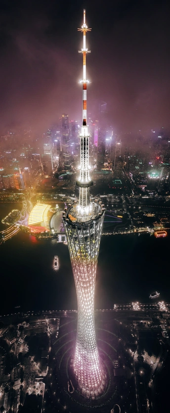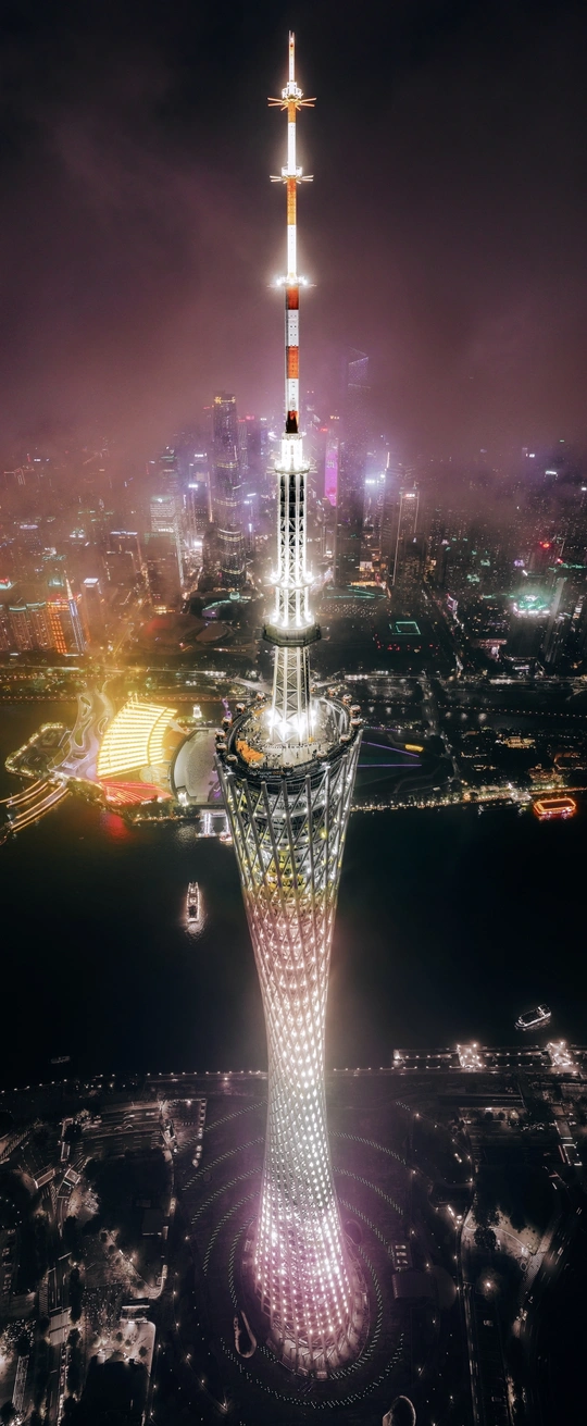 广州塔位于海珠区赤岗塔附近,珠江新城地处天河区,二者隔珠江相望,构成城市中轴线与滨水景观带的视觉焦点。广州塔600米总高与珠江新城摩天楼群形成高低错落的天际线,珠江作为纽带串联双地标,形成“一塔一城”的滨江景观格局。