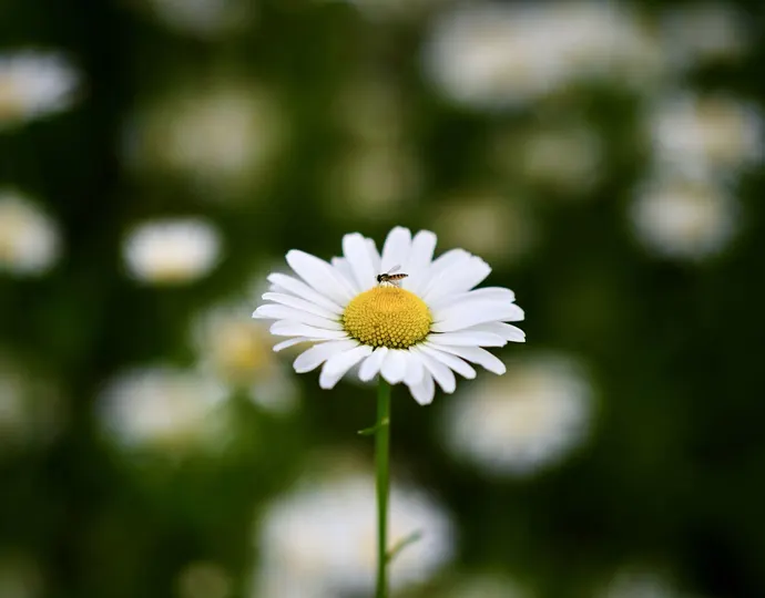 一朵雏菊花,洁白的花瓣围绕着明亮的黄色花心,清新雅致。一只小巧的飞虫停歇在花心之上,自然、静谧且充满生机,仿佛让人置身于恬静的春日花园。