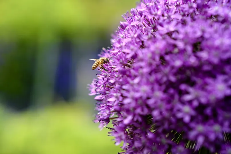 公园里,一只蜜蜂正忙碌于紫色大花葱之间,花朵由无数细碎小花紧密簇拥而成,色泽浓郁艳丽,呈现出梦幻般的紫色,营造出了自然清新的氛围,也传递出生命的活力与美好。