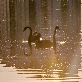 夕阳倾洒,湖面碎金闪烁。两只黑天鹅优雅游弋,身姿在波光里缱绻。它们似是这湖间的精灵,于光影交错间,勾勒出一幅静谧而浪漫的画,时光仿佛也在此刻温柔停驻。
