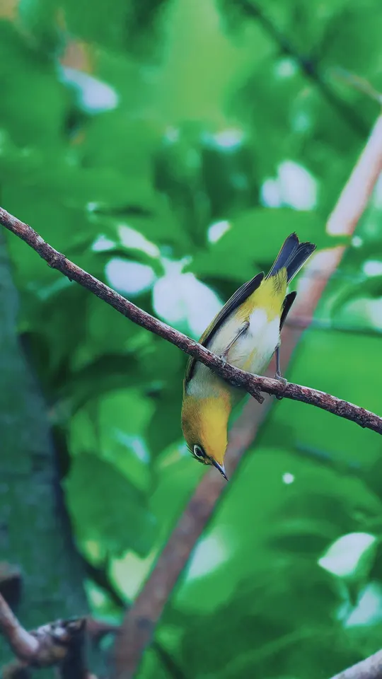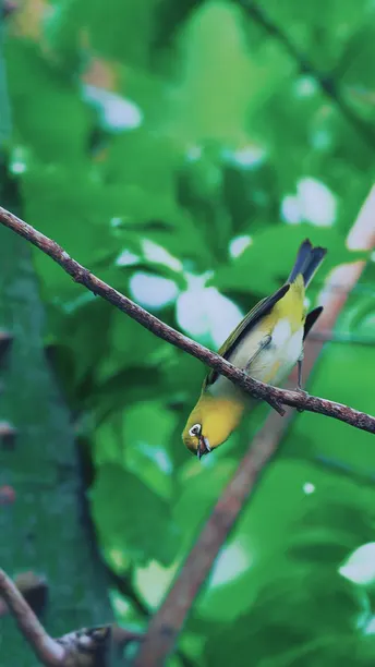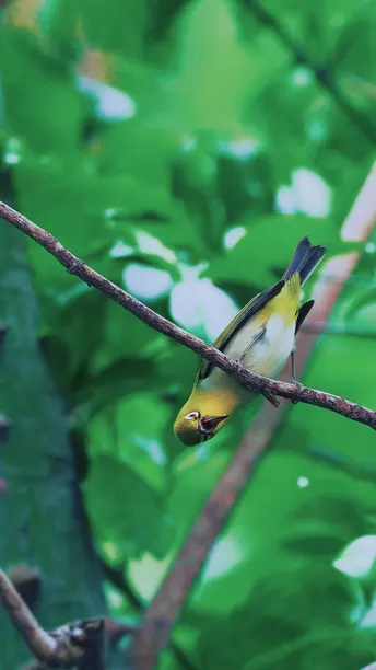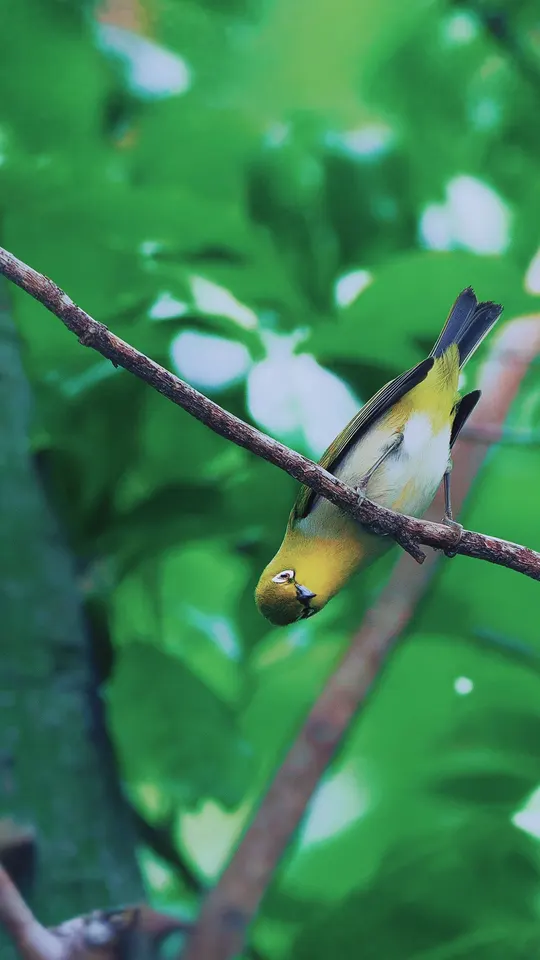 金钩倒悬的绣眼倏地展开珍珠白腹羽。 纤细趾爪紧扣枝桠,如绷紧的芭蕾足尖。