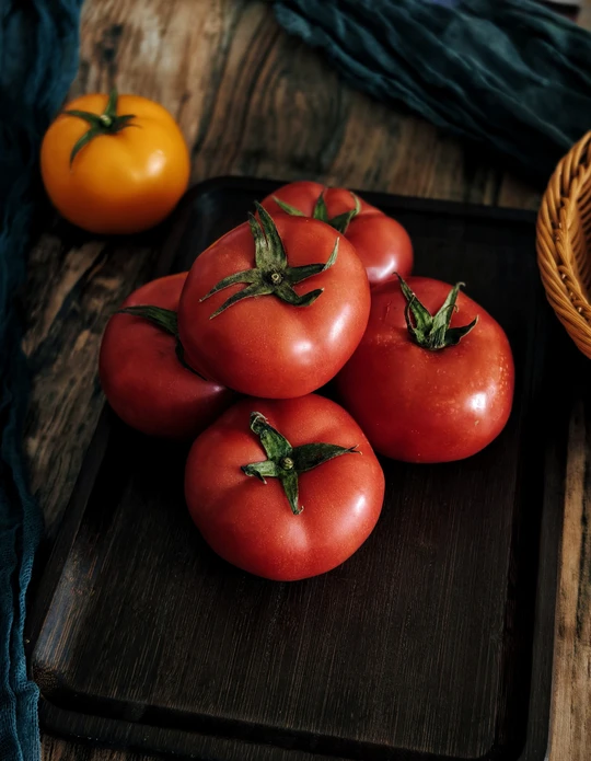 肥肥的西红柿,色泽饱满而娇艳,绿绿的四角叶,舒展开来,特别诱人,故买回家来摆拍了。