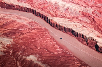 此刻的我正驾车驶入张掖一处峡谷深处,当我停下升起无人机,眼前的一幕让我深受震撼。殷红的大地上,两侧大地之树般的血色纹路不断延伸,独特的地貌生平仅见 丹霞是指红色砂砾岩经长期风化剥离和流水侵蚀,形成的孤立的山峰和陡峭的奇岩怪石,这里的丹霞地貌发育于距今约2亿年的前侏罗纪至第三纪 拍摄器材:大疆御三pro