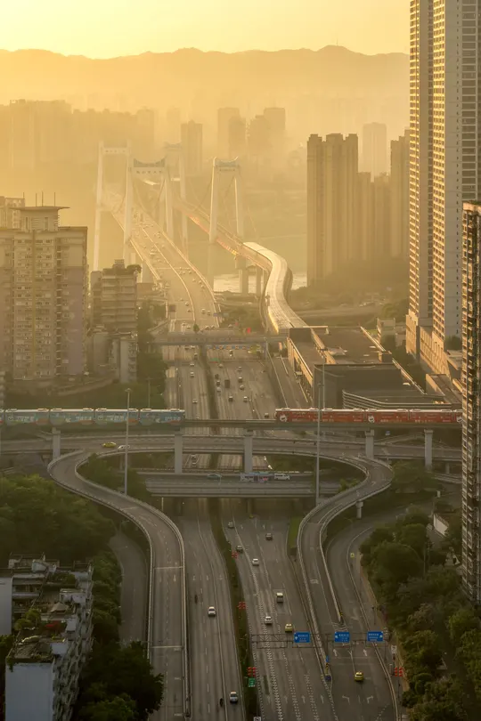 早上6点半,当日光撒在鹅公岩大桥上,天空被渐渐染上了一层柔和的暖色,多条高架道路蜿蜒交错,车辆在其上有序行驶。远处,鹅公岩大桥横跨天际,与周围高低错落的建筑物共同构成了一幅壮丽的城市画卷。